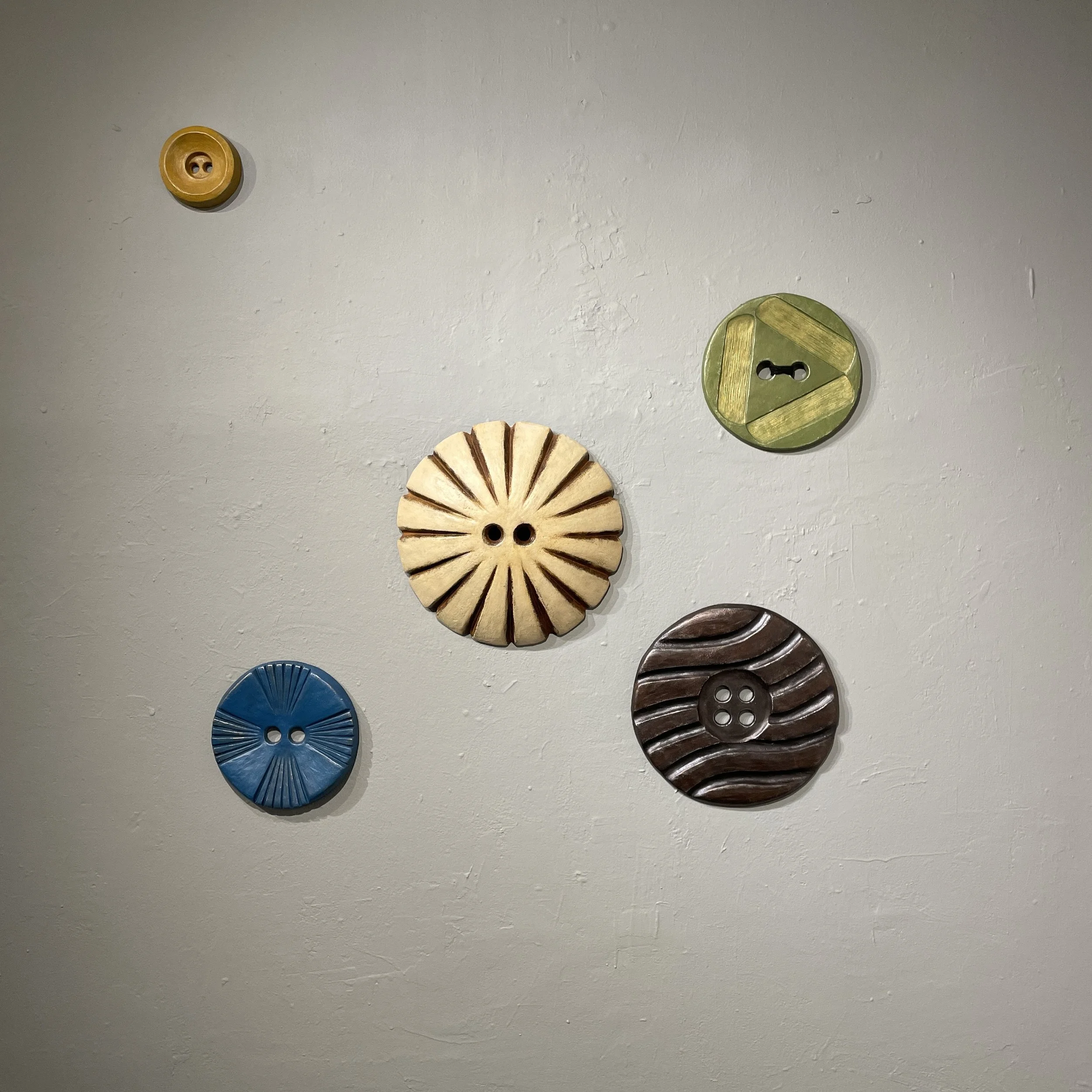 The Vintage Button Series is a metaphorical exploration of a mother's journeying efforts of 'keeping it all together'. Sifting and gleaning pieces from various generations of button collections, then hand sculpting and casting them larger than life reflects the process of everything discovered, pondered, and endured on the journey of motherhood. Each button, seemingly a portrait, honors the mothers before us, and the stories and memories that shaped their lives.